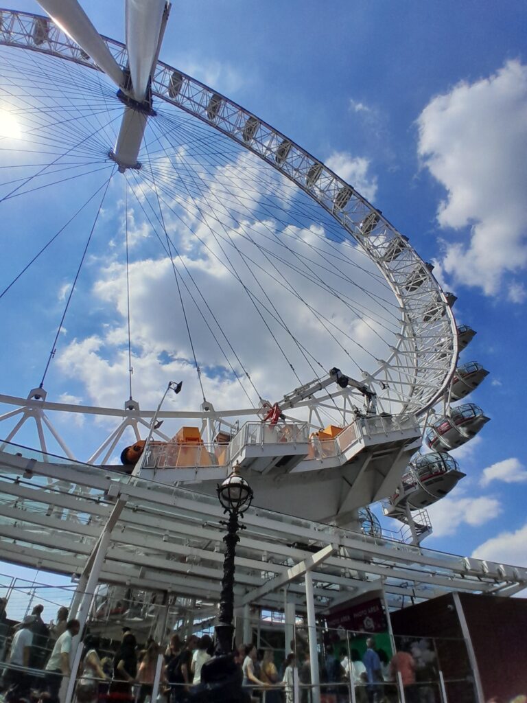 This observation wheel, unlike a Ferris wheel, does not stop to let people on or off. Instead, it continuously moves at a slow speed so that people can easily board the capsule as needed. There are a total of 32 capsules in the London Eye.